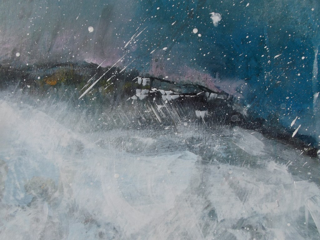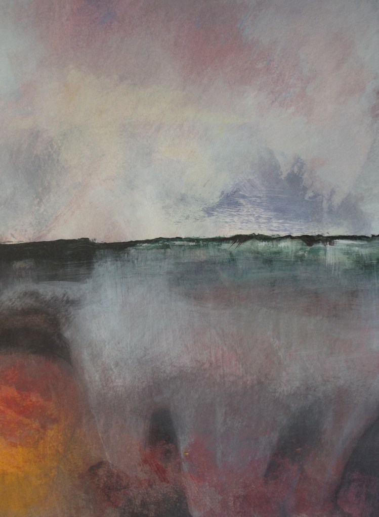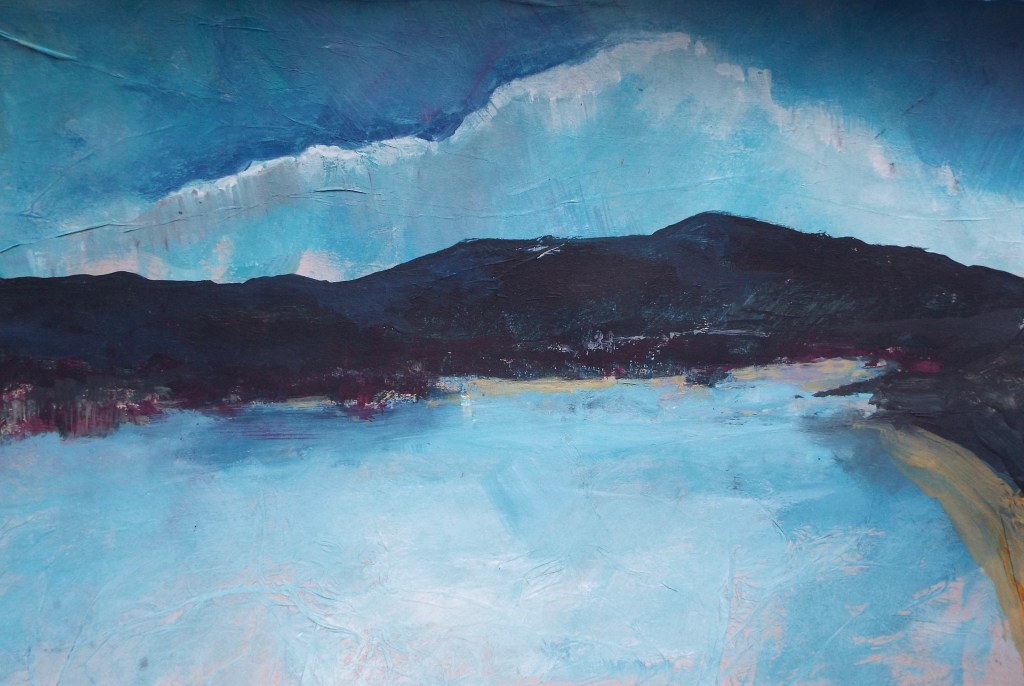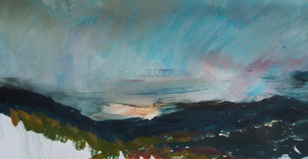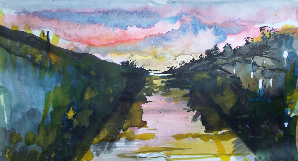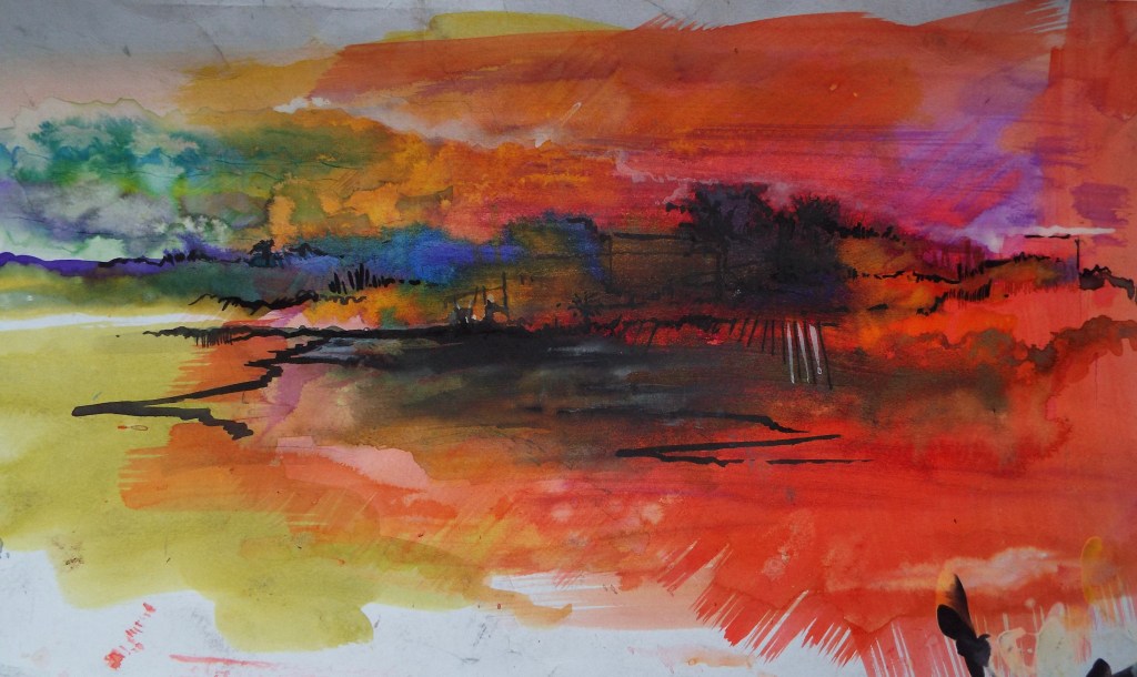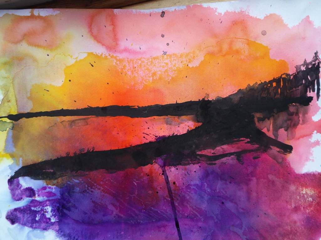When Stephen returns to his studio he develops ideas for final paintings, by using a combination of acrylic paints, Indian inks and watercolours.