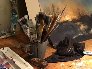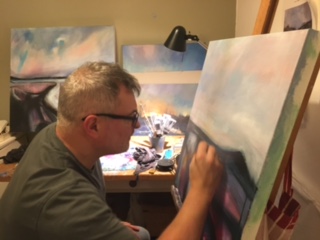 Stephen’s work is primarily concerned with light and the impact it has on the landscape. He aims to create atmosphere in his work through colour, mark making, texture and composition. He will sketch outdoors and take photographs for reference, before returning to his studio to paint. He uses mixed media, acrylic and oil paint